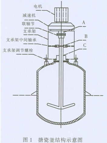 (4)設(shè)備整體找正找平。因?yàn)閷?shí)際上密封的安 裝基準(zhǔn)面是釜?dú)んw,而攪拌的安裝基準(zhǔn)面既有釜 殼體還有支架。就是說(shuō)在整體安裝后,既要保證攪 拌和釜體的垂直對(duì)中,又要保證攪拌和密封的同 軸度,即從電機(jī)輸出軸端(聯(lián)軸節(jié)處)點(diǎn)A,到中間 支承軸承點(diǎn)B,再到密封中心點(diǎn)C,三點(diǎn)ABC為一 直線且垂直于水平面。參見(jiàn)圖1。