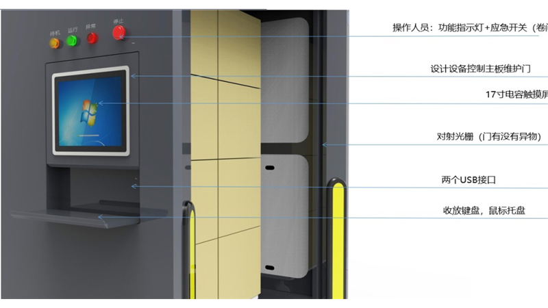 22工控觸摸顯示屏,配備可收放鍵盤,方便實(shí)時交互輸入操作。工控顯示屏鑰匙開啟后可上掀,方便維護(hù)。